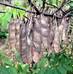 - Spłaszczony, zielony (z czasem brązowiejący) strąk[5].