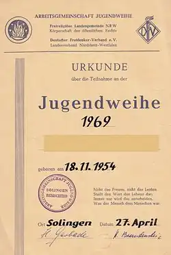 - 1 2 Bedeutung und Geschichte von Jugendweihen und Jugendfeiern. [w:] Deutsche Freidenker Verband [on-line]. [dostęp 2017-10-02]. [zarchiwizowane z tego adresu (2017-10-03)]. (niem.).