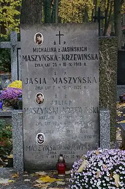 - ↑ Cmentarz Stare Powązki: MICHALINA MASZYŃSKA-KRZEWIŃSKA, [w:] Warszawskie Zabytkowe Pomniki Nagrobne [dostęp 2020-12-09].