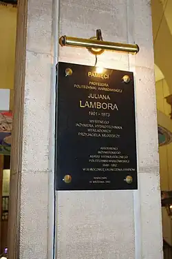 ![]() Tablica poświęcona Julianowi Lamborowi na Politechnice Warszawskiej | |