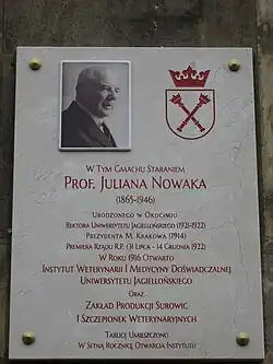 Tablicę poświęconą pamięci tego wybitnego naukowca odsłonięto 28 marca 2016 przy ul. Czystej 18 w Krakowie. Wmurowano ją w ścianę kamienicy, w której 100 lat temu z inicjatywy prof. Juliana Nowaka otwarto Instytut Weterynarii i Medycyny Doświadczalnej Uniwersytetu Jagiellońskiego oraz Zakład Produkcji Surowic i Szczepionek Weterynaryjnych. Fundatorem tablicy jest Stowarzyszenie Miłośników Ziemi Okocimskiej[13].