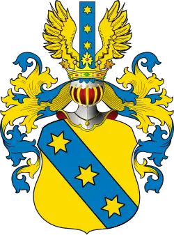 W polu złotym skos błękitny, obarczony trzema gwiazdami złotymi. Klejnot: nad hełmem w koronie słup błękitny obarczony trzema gwiazdami złotymi, między dwoma takimiż skrzydłami orlimi. Labry błękitne, podbite złotem.