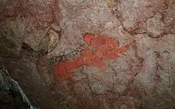 Wśród wszystkich malowideł najbardziej znane przedstawia brodatego człowieka w długiej czarnej pelerynie i wyszukanym nakryciu głowy. Jego ręce oraz nogi pokryte są skórą jaguara. Postać w prawej ręce trzyma trójząb, a w lewej węża lub pofalowany przedmiot. Przed nim znajduje się znacznie mniejsza postać w pozycji siedzącej[4]. Malowidło ma dwa metry wysokości i jest jednym z nielicznych przykładów w ikonografii olmeckiej przedstawiającej dominację jednego człowieka nad drugim. Niektórzy badacze sądzą, że jest to scena składania ofiar z ludzi[3].