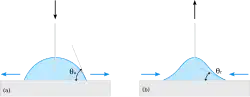 a kąty i oznaczają odpowiednio kąt zwilżania dla cieczy rozlewającej się i dla cieczy cofającej się.
