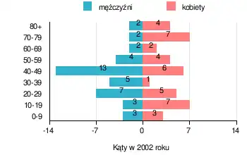 (w przedziałach wiekowych w 2002 roku)OGÓŁEM 0-9 10-19 20-29 30-39 40-49 50-59 60-69 70-79 80+ I. OGÓŁEM os. 80 6 10 12 6 19 8 4 9 6 – odsetek % 100 7,4 12,5 15 7,5 23,8 10 5 11,3 7,5 1. WEDŁUG PŁCI A. Mężczyzn os. 41 3 3 7 5 13 4 2 2 2 – odsetek % 51,3 3,7 3,7 8,8 6,3 16,3 5 2,5 2,5 2,5 B. Kobiet os. 39 3 7 5 1 6 4 2 7 4 – odsetek % 48,7 3,7 8,8 6,2 1,2 7,5 5 2,5 8,8 5