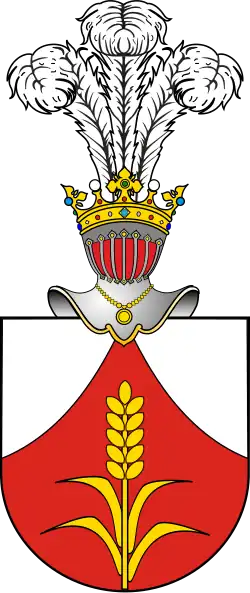 W polu czerwonym lilia srebrna, na gałązce zielonej z czterema takimiż listkami - po dwa na stronę. Klejnot: trzy pióra strusie. Labry czerwone, podbite srebrem.