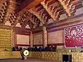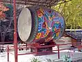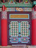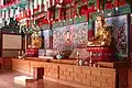 Po prawej i lewej stronie znajdują się rzędy wspaniale kolorowych wzorów w kształcie płomieni, w których znajdują się postacie 20 buddyjskich bóstw.