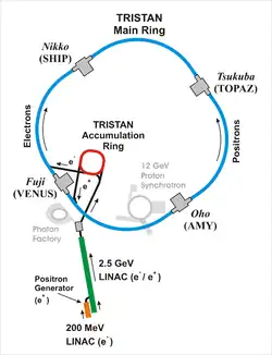 - Akcelerator cząstek TRISTAN składał się z kilku akceleratorów wstępnych oraz pierścienia głównego (MR, ang. Main Ring) o obwodzie trzech kilometrów, służącego do jednoczesnego przyspieszania elektronów i pozytonów oraz ich zderzenia z energią środka masy dochodzącą do 64 GeV. Motywacją do konstrukcji była teoria wysunięta przez Makoto Kobayashiego i Toshihide Maskawę w 1973 roku, mająca na celu wyjaśnienie naruszenia CP w ramach modelu standardowego przez wprowadzenie trzeciej generacji kwarków. Każda generacja składa się z dwóch kwarków: pierwsza generacja - kwarki u i d, druga generacja - kwarki s i c, trzecia generacja - kwarki b i t. W tamtym czasie potwierdzone było istnienie trzech kwarków: u, d i s. Istnienie pozostałych trzech należało jeszcze potwierdzić doświadczalnie. Kwark c wykryto niezależnie w Stanford Linear Accelerator Center i Brookhaven National Laboratory w 1974 r., a kwark b w Fermilabie w 1977 r. Pod koniec lat 70. w KEK opracowano plany budowy akceleratora cząstek do poszukiwania ostatniego kwarku t, a budowę rozpoczęto w 1981 r. Akcelerator działał od 1986 r., ale pod koniec lat 80. stało się jasne, że nie dysponuje on wystarczającą energią środka masy do wyprodukowania kwarku t. W rezultacie zaczęto planować następcę projektu KEKB, a przebudowa rozpoczęła się w 1994 roku; TRISTAN został ostatecznie zamknięty w 1995 roku[5].