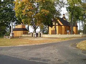 Dzwonnica z końca XVIII w., konstrukcji słupowej, oszalowana, o dwóch kondygnacjach, nakryta czterospadowym dachem. Przed kościołem kapliczka słupowa z rzeźbą św. Floriana z końca XVIII w. Kapliczkę ustawiono w 1838 r. jako wotum kosztem Tomasza i Antoniny Patorów z domu Wilmańska.