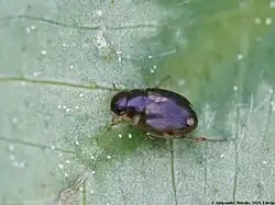 Chrząszcze o owalnym, wysklepionym w stopniu słabym do umiarkowanego ciele długości od 1,6 do 4 mm. Ubarwienie wierzchu ciała jest żółtawe z ciemną, metaliczną plamą pośrodku przedplecza oraz rozmaicie wykształconym ciemnym wzorem na pokrywach[4].