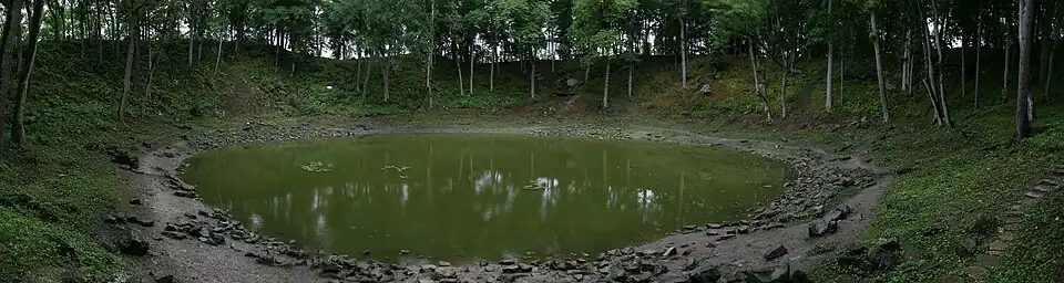 ![]() Jezioro meteorytowe Kaalijärv wypełniające krater, przy niskim stanie wody | |