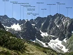 ![]() Od lewej: Zmarzły Szczyt, Kaczy Szczyt, Batyżowiecki Szczyt, zbocza Gerlacha nad Batyżowieckim Stawem | |