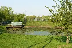 Kajce towarzyszy drugi, bezimienny staw, o prawie okrągłej linii brzegowej. Znajduje się kilkadziesiąt metrów na południowy zachód, na terenie tych samych ogrodów działkowych.