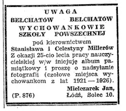 - ↑ Stanisław Miller – nauczyciel, pierwszy kierownik szkoły im. A. Mickiewicza w Bełchatowie, wiceburmistrz Bełchatowa. Celestyna Millerowa – nauczycielka, bełchatowska działaczka społeczno-kulturalna.