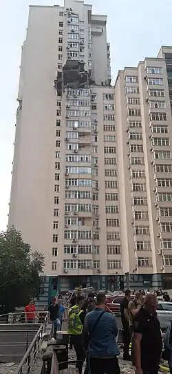 W wyniku ataku rakietowego za pomocą rakiety Iskander-K (wystrzelonej przez bombowiec Tu-95MS znad Morza Kaspijskiego) na dwa dwupiętrowe budynki na przedmieściach Dniepru zginęła dwuletnia dziewczynka, a 22 osoby zostały średnio i ciężko ranne, w tym pięcioro dzieci; 17 osób było hospitalizowanych, a kilka prawdopodobnie zostało uwięzionych pod gruzami[37][40][41][42].