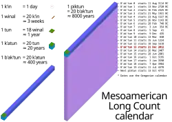 W języku Majów kin to dzień, 20 kin to uinal, osiemnaście uinal to tun[13], 20 tun to katun, 20 katun to baktun. (Rzadko były używane też większe jednostki: pictun, calabtun, kinchiltun i alautun.)
