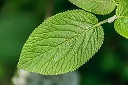 - Jajowatoeliptyczne, tępo zaostrzone, u nasady zwykle nieco sercowato wcięte, o długości 5–15 cm i szerokości 3–9 cm, o krótkich (1–2 cm) ogonkach, bez przylistków. Są dosyć grube i mają ząbkowane brzegi. Spodem szarobrunatne, z wierzchu ciemnozielone i całe pokryte takim samym, jak pędy, gwiazdkowatym kutnerem.