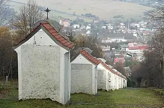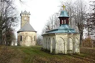 Jedenaście rokokowych stacji drogi krzyżowej, drewnianą kaplicę Podniesienia Krzyża Świętego oraz rokokowy Grób Pański polecił wybudować ksiądz Gottfried Liessner w 1759. Pierwotną drewnianą kaplicę zniszczył huragan w 1779, ale nie naruszył drewnianego, historycznego krzyża. W 1783 położono kamień węgielny pod obecną kaplicę szczytową. Ostatecznie wyświęcono ją w 1796 (wieżę dobudowano później, dzwony zamontowano w 1886).
