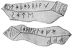 - ↑ Mindy MacLeod and Bernard Mees: Runic Amulets and Magic Objects. Woodbridge: Boydell Press, 2006, s. 112. ISBN 1-84383-205-4.