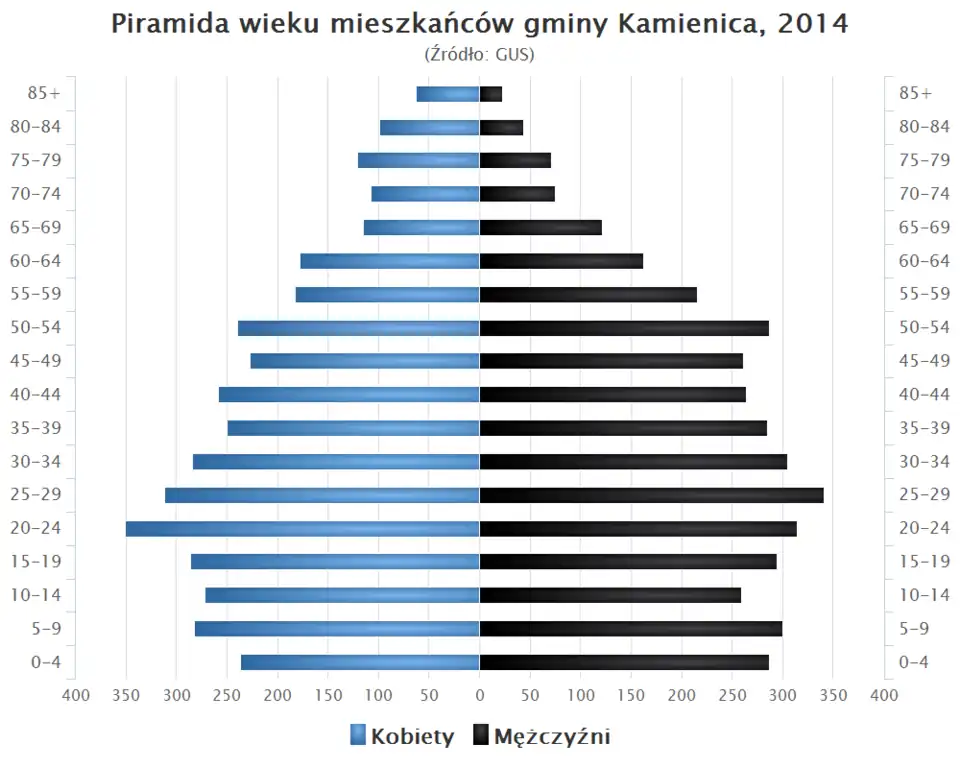 - Piramida wieku mieszkańców gminy Kamienica w 2014 roku[1].