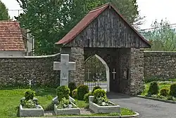 - kamienny krzyż monolitowy, zapewne późnośredniowieczny[34] przed wejściem na cmentarz przykościelny; pojawiające się określenie tego krzyża jako krzyża pokutnego nie ma oparcia w dowodach i oparte jest wyłącznie na nieuprawnionym założeniu, że wszystkie stare kamienne monolitowe krzyże, są krzyżami pokutnymi (pojednania)[35], chociaż w rzeczywistości powód fundacji takiego krzyża może być różnoraki, tak jak każdego innego krzyża