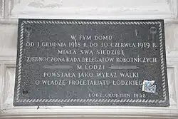 W latach 1918–1919 siedziba Zjednoczonej Rady Delegatów Robotniczych miasta Łodzi, o czym informuje pamiątkowa tablica znajdująca się na elewacji.