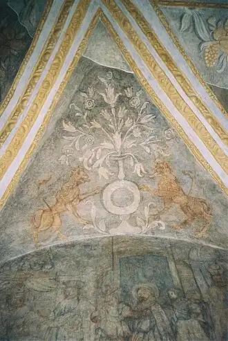 Początkowo jedno piętro z trzema kondygnacjami piwnic, podcieniami oraz szeroką sienią wyróżnia się układem ganków i galerii wokół wewnętrznego dziedzińca (wiaty), a także bogatymi zdobieniami w „wielkiej izbie” zdobioną późnorenesansowymi malowidłami – scenami Męki Pańskiej (malowidła, sztukateria). Przebudowana i rozbudowana w XIX wieku.