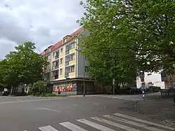 ![]() Widok ogólny Targu Węglowego. Kamienica Letscha na końcu pierzei po lewej, zwieńczona wieżyczką | |