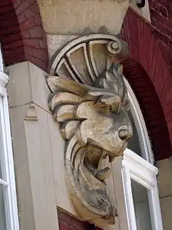 W cofniętym ryzalicie okna rozmieszczono wzdłuż jednej osi, doświetlają one klatkę schodową i są na innych poziomach niż pozostałe okna. Okna na parterze i środkowe okno drugiego piętra mają półokrągłe nadproża[11]. Pozostałe okna tejże fasady mają nadproża o spłaszczonym łuku[11]. Belkowanie ponad trzecią kondygnacją ozdobiono zapisem nutowym[10] melodii pieśni Jana Galla pt. Dziewczę z buzią jak malina[14]. Narożnik z wykuszem, który symbolicznie podtrzymuje lew-maszkaron[3] został zaakcentowany szczytem zakończonym wieżyczką[10]. Nad wykuszem utworzono balkon[4].