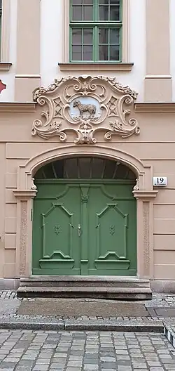 Trzykondygnacyjna kamienica została wzniesiona w 1776 roku w miejsce starszego budynku z wykorzystaniem jego murów. Dziewięcioosiowa fasada była artykułowana międzykondygnacyjnymi gzymsami; w narożach znajdowały się boniowane lizeny, parter był boniowany[3]. Trzy środkowe osie okienne były otoczone na drugiej i trzeciej kondygnacji pilastrami wielkiego porządku i dodatkowo zaakcentowane pseudoryzalitem[3]. Nad nimi wznosiła się dwukondygnacyjna facjata z pilastrową artykulacją a powyżej, w osi środkowej umieszczona była lukarna w architektonicznej obudowie[3]. Budynek był pokryty mansardowym dachem o układzie kalenicowym. W czwartej osi licząc od południa umieszczony został portal[3] a nad nim umieszczono supraportę z płaskorzeźbioną dekoracją w formie kartusza z motywami liści akantu, kratki regencyjnej oraz wolut. Pośrodku umieszczono godło domu a poniżej znajdowała się data wzniesienia kamienicy[2]. Płaskorzeźba została zniszczono podczas odbudowy domu po 1945 roku, odtworzona w 2015 roku[3].