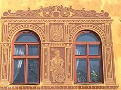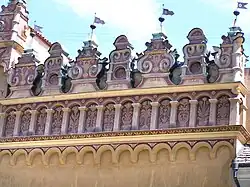 Budynek składa się z dwóch części: lewej (patrząc od frontu) trójkondygnacyjnej i (według dyspozycji piętra) trzyosiowej oraz prawej – dwukondygnacyjnej i czteroosiowej. Obie części, malowane tradycyjnie na kolor ochry, mają fronty zwieńczone wydatnymi, ażurowymi attykami balustradowymi, które tworzy rząd sterczyn ozdobionych wolutami. Attyki są podparte fryzami arkadkowymi, z których prawy (na niższej części budynku) jest dwukondygnacyjny.