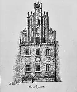 W drugiej połowie XIV wieku parcela została zwężona a kamienica przebudowana na dwutraktowy i dwupiętrowy budynek z trzyosiową fasadą zakończonym późnogotyckim szczytem uskokowym[4]. W XVII wieku nad wejściem umieszczono portal z wykrępowanym boniowaniem opinającym archiwoltę, węgary i toskańskie pilastry[5]. Nad belką znajdowała się płaskorzeźba anioła<ref>Szkic portalu w kamienicy nr 14 ref>[5]. Pod koniec XVI wieku kamienica została przebudowana, o czym ma świadczyć portal w przyziemiu[3].