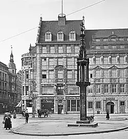 - ↑ Jej powstanie wiązało się z kontrowersjami związanymi z wyburzeniem starych kamienic pod budowę Domu handlowego braci Barasch oraz po wyburzeniu renesansowej kamienicy Pod Złota Koroną[25]