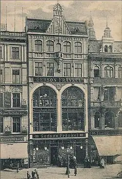 W 1896 zostały one wyburzone, a w ich miejsce wzniesiono dom handlowy Gersona Fränkla[a], wg projektu Juliusa Hinroja[4]. Nowy budynek miał pięć kondygnacji: na pierwszych trzech znajdowały się sklepy, na dwóch kolejnych magazyny i pracownie konfekcji. Elewacja budynku była dwudzielna; fasada na parterze była przeszklona, na dwóch wyższych kondygnacjach w dwóch kamiennych arkadach umieszczono okna witrynowe. Na czwartej i piątej kondygnacji znajdowały się mniejsze okna w stylu neogotyckim. Fasada zakończona była neogotyckim szczytem[5].