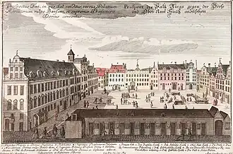 Działka lokacyjna nr 15 była odnotowana już w XIV wieku, miała wówczas szerokość 40 łokci i należała do Piotra Stengila, rajcy, ławnika i posiadacza ziemskiego[2]. Nowa kamienica murowana została wzniesiona w połowie XVI wieku[3]. Według grafiki Friedricha Wernera była to wówczas trzykondygnacyjna, trzyosiowa kamienica z dwukondygnacyjnym szczytem. W osi wschodniej znajdował się portal wejściowy[4] datowany na przełom XVI i XVII wieku. Był to łukowy portal, z węgarami dekorowanymi zdwojonymi pilastrami o prostych, profilowanych głowicach. Archiwolta była ozdobiona motywem fali, a w przyłuczach znajdowały się diamentowe bonie. W osi węgarów znajdowały się spływy wolutowe podtrzymujące belkowanie. U góry znajdował się trójkątny naczółek, a jego polu umieszczony był ornament okuciowy z lwimi głowami i puttami. Na środku umieszczony był kartusz z herbem prawdopodobnie rodziny von Eben und Brunn. Z prawej strony portalu, u dołu, znajdowało się okienko piwniczne w kamiennej opasce. Wizerunek portalu został przedstawiony na grafice Heinricha Mützela powstałej w 1825 roku[5].