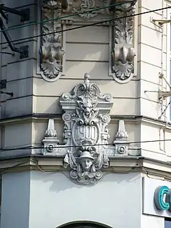 Na rogu kamienicy znajdują się dwa kartusze – jeden z inskrypcją „1900”[4] i znajdującą się poniżej płaskorzeźbą przedstawiającą głowę[7], a powyżej z monogramem „GB”[4]. W narożu kamienicy znajduje się także balkon. Dolna płyta balkonowa jest położona na wysokości trzeciej kondygnacji. Pootrzymuje ona górną płytę balkonową za pomocą czterech okrągłych kolumn z głowicami w kształcie esownic. Dolna płytę zaś pootrzymują zdobione wsporniki[7].