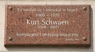 W kamienicy w 1909 roku urodził się i do 1929 roku mieszkał kompozytor i pedagog muzyczny Kurt Schwaen, co upamiętnia umieszczona w 2009 roku na fasadzie kamienicy tablica pamiątkowa[1].