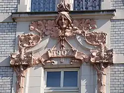 Fasada kamienicy jest niesymetryczna, licowana białą, glazurowaną cegłą. Posiada ona bogate[10], tynkowane dekoracje[3] o tematyce secesyjnej, barwione w kolorze różu malwy[11] w szczytach, konsolach wspierających balkony oraz w okolicach okien[10]. Fasada ta jest dziewięcioosiowa, z dwoma ryzalitami zwieńczonymi szczytami o bardzo delikatnych ornamentach w postaci liści kasztanowca i głów kobiecych. Pomiędzy szczytami, nad dwuspadowym dachem znajdują się cztery lukarny[11].