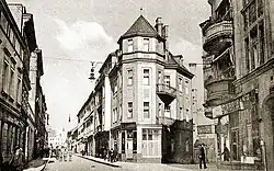 Ulica Krakowska w Tarnowskich Górach, po prawej narożna kamienica pod nr. 12 (zdj. 2015) | |||