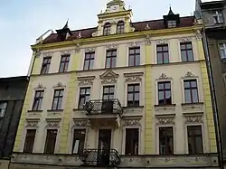Architektonicznie budynek cechuje się stylem historyzmu[2] (bądź eklektyzmem[5]). Bogata w zdobienia i dekoracje fasada jest siedmioosiowa[5] i otynkowana[2], z wtórnie przbudowanym parterem[2]. Na drugiej i trzeciej kondygnacji osi środkowej zachowały się balkony[5]. Opaski okien mają neobarokową dekorację tynkową w postaci kartuszy i girland, a stolarka okienna jest czterokwaterowa ze ślemieniem[2]. Fasadę wieńczy dekoracyjna[5] dwuosiowa facjatka w neomanierystycznym obramieniu[2].