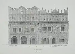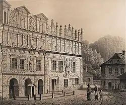 Kamienice na litografii Adama Lerue (ok. 1858)[1]- Szczegół kamienicy św. Mikołaja