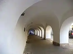 Arkadowe, otwarte podcienia to jeden z najbardziej rozpoznawalnych elementów tarnogórskiej architektury. Takie arkady miały dawniej jeszcze dwie sąsiednie kamienice. Utrzymane w stylistyce renesansowej budynki podlegały jednak wielu przeróbkom. Obecny wygląd domy z podcieniami uzyskały w początkach XIX wieku, część obiektów tej pierzei przebudowano natomiast całkowicie na przełomie XIX i XX wieku. We wnętrzach zachowały się archaiczne cechy architektoniczne – sklepione kolebkowo piwnice, kamienne odrzwia z gmerkiem wykonawcy.