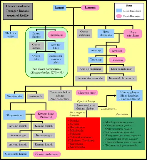 - Kanayamabiko-no-kami (jap. 金山毘古神), rodzi się z wymiociny i odchodów Izanami