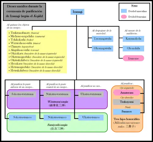 Według Kojiki, bogowie narodzili się w wyniku wzajemnych relacji Izanami i Izanagiego oraz działania bóstwa ognia, Kagutsuchi, który przy porodzie spalił genitalia Izanami i śmiertelnie ją ranił[1][2]. Izanagi, będący świadkiem śmierci ukochanej żony, poćwiartował swoje dziecko[3], a z jego krwi i odciętych części ciała narodziło się wielu kami[3]. Następnie Izanagi zszedł do krainy ciemności Yomi (świat zmarłych) w poszukiwaniu Izanami. Odnalazł ją, ale gdy okazało się, iż jej ciało jest w stanie rozkładu, a z poszczególnych części ciała rodzą się kolejni bogowie, rzucił się od ucieczki[4]. Będąc już bezpiecznym przystąpił do rytuału oczyszczania (misogi), podczas którego zrodzili się kolejni kami[5], którzy są najważniejszymi bóstwami shintō: Amaterasu – bogini słońca, Tsukuyomi – bóstwo księżyca oraz Susanoo – bóg mórz[6].