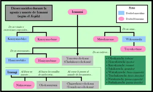 - Podczas porodu Kagutsuchi, genitalia Izanami zostały spalone, a ona została śmiertelnie ranna. W jej agonii, z jej wymiotów, moczu i kału zrodziło się wielu kami[2]: