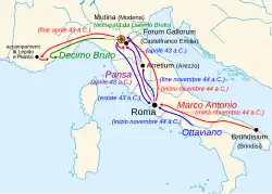Sytuacja Antoniusza nie była stabilna także i w jego stronnictwie, gdyż latem stracił poparcie byłych cezariańskich konsuli, a Oktawian skutecznie atakował każdą jego próbę obrony pamięci Cezara. W grudniu Antoniusz opuścił Rzym z armią, by odebrać Galię Przedalpejską jej namiestnikowi – Decymusowi Juniuszowi Brutusowi. W tym samym czasie Oktawian ruszył do Południowej Italii, gdzie zbierał nielegalną, prywatną armię z sił, które Antoniusz przeniósł z Macedonii[18]. Pod koniec roku Oktawian i Cyceron zawarli sojusz: Cyceron i Senat zyskiwali prywatną armię Oktawiana w celu walki z Antoniuszem, natomiast Oktawian otrzymywał poparcia Cycerona w Senacie[19].