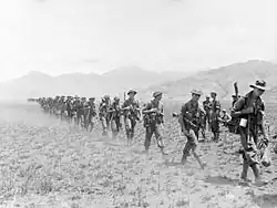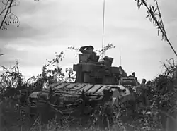 ![]() Czołg Matilda o nazwie własnej „Clincher” zmierza w kierunku japońskich pozycji w pobliżu Finschhafen, 9 listopada 1943 | |||