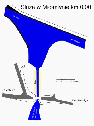 - kilometr 0,0 – Śluza Miłomłyn. W tym miejscu rozpoczyna się kilometraż w kierunkach: