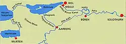 Cały kanał, długości 8 km, leży w granicach kantonu Berno. Stanowi w rzeczywistości sztuczny fragment koryta rzeki Aare. Jego początek znajduje się w mieście Aarberg, gdzie został włączony do naturalnego koryta Aare. Ujście do jeziora Bienne znajduje się w miejscowości Hagneck. Przebiega przez tereny gmin Aarberg, Bargen, Walperswil, Täuffelen i Hagneck[1].
