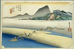Drzeworyt ukiyo-e autorstwa Hiroshige Andō przedstawia przeprawiających się przez rzekę kupców wraz ze zwierzętami jucznymi, a w tle Kanaya-juku.
